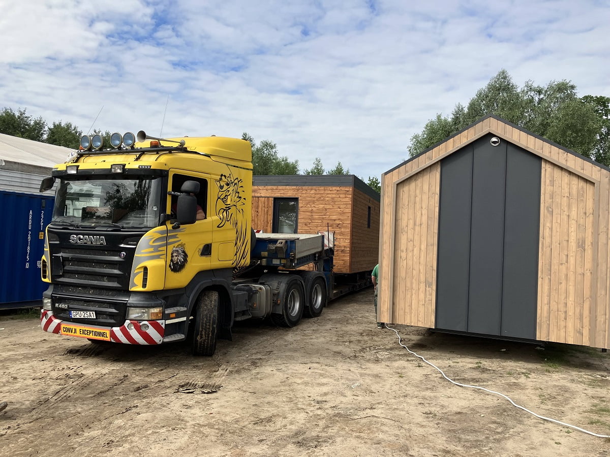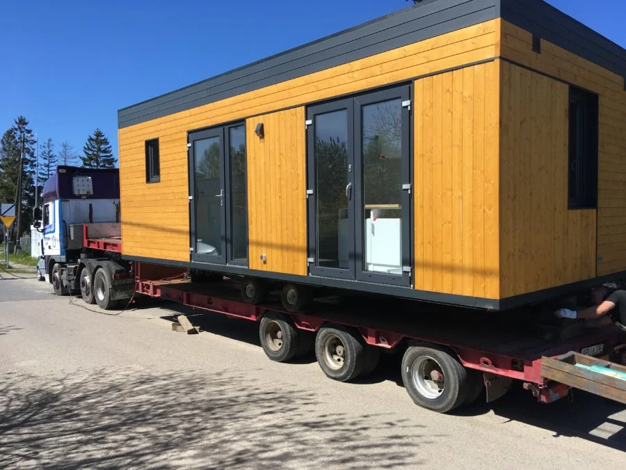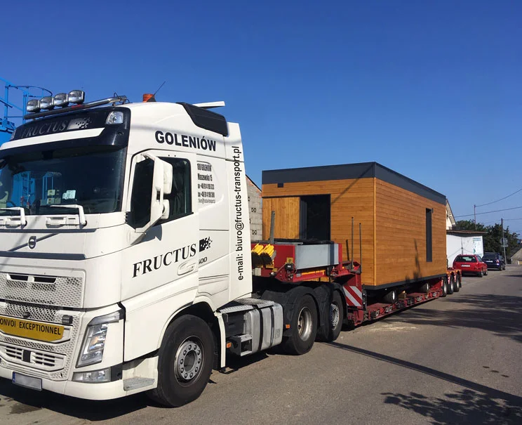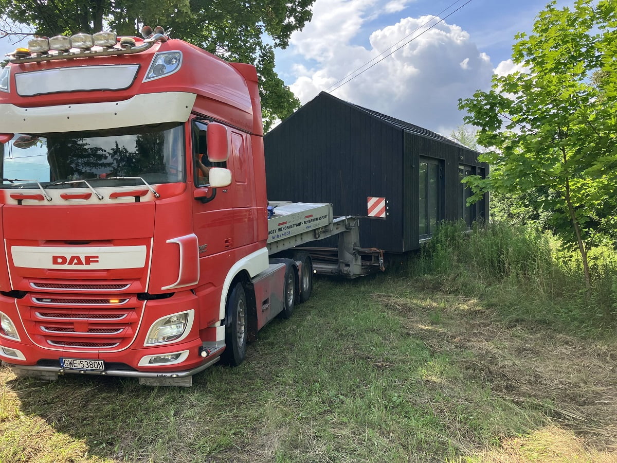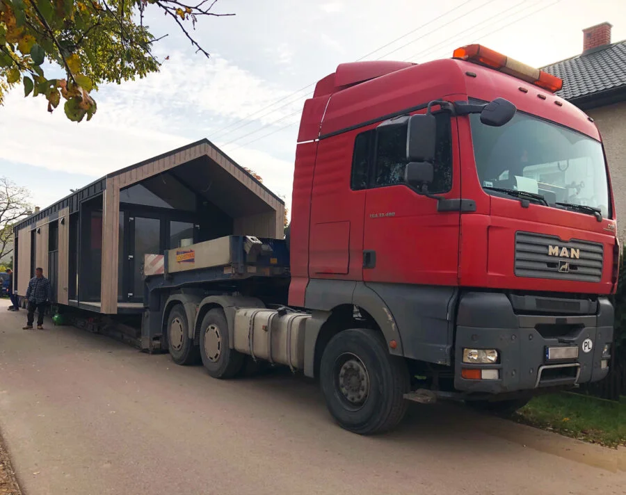 Gotowy dom transportowany jest na miejsce specjalistycznym - niskopodłogowym, transportem drogowym. Koszt transportu nie jest wliczony w cenę domu, jego wartość zależy od docelowej lokalizacji oraz szerokości domu.